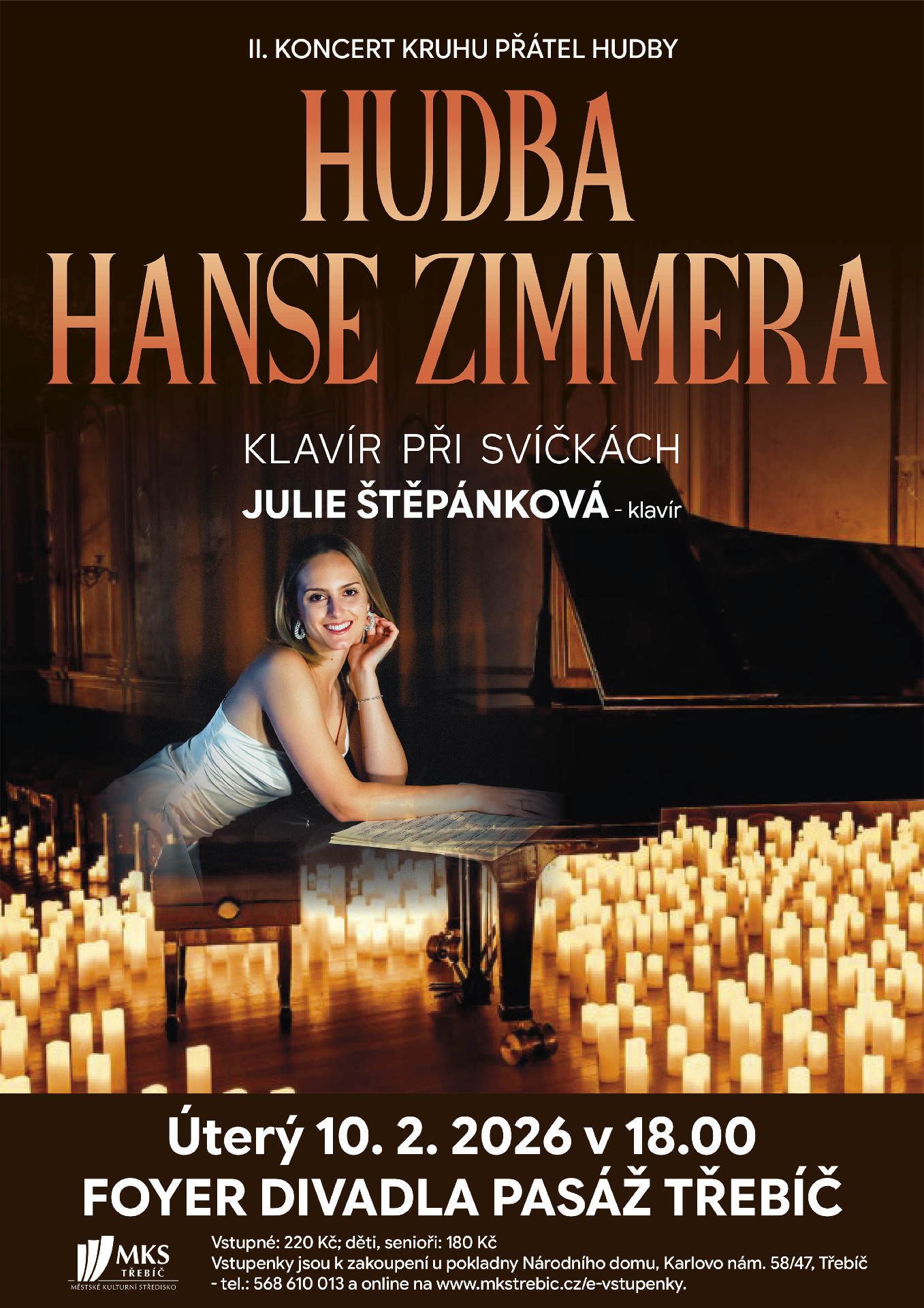 Jedinečný večer filmové hudby v intimní atmosféře temného sálu a svíček. Můžete se těšit na nejslavnější skladby Hanse Zimmera zaranžované pro sólový klavír, z nichž hlavní prostor dostane emocionálně strhující hudba z filmu Interstellar. Hudební zážitek bude doplněný dalšími ikonickými motivy Zimmerovy tvorby. Za klavír usedne Julie Štěpánková, studentka Janáčkovy akademie múzických umění, držitelka několika ocenění z mezinárodních soutěží (např. 2. cena ze soutěže Concorso pianistico internaziole “città di Arona”). Klavíristka také vystoupila jako sólistka s Moravskou filharmonií Olomouc. Přijďte se zaposlouchat do filmových světů, kde se ticho a tma propojuje s hvězdami.