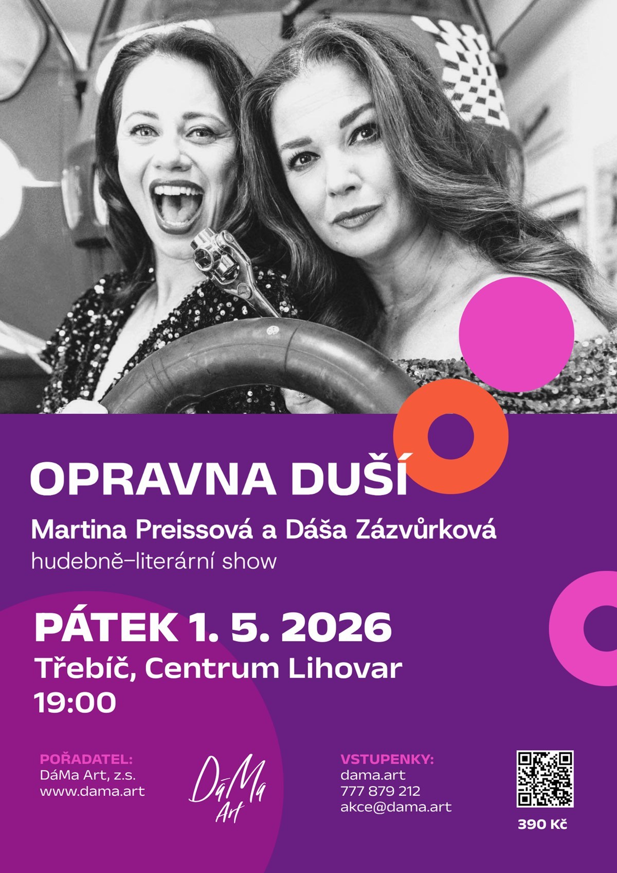 Máte manžela? Máte manželku? Jste svobodní? Jste málo šťastní, nebo příliš bezstarostní? Cítíte se někdy sami, nesnášíte nakupování, nebo trpíte nadváhou? Máme lék na mnoho vašich starostí. A jak to děláme? Donutíme vás na ně během našeho pořadu zapomenout! Na každou vaši drobnou starost máme náplast ve formě duetu, fejetonu, stand upu nebo sólového šansonu. To vše z naší autorské dílny a s notnou dávkou humoru. Zaposloucháte se nejen do autorského čtení z knih herečky a autorky Martiny Preissové ale i do písní zpěvačky a herečky Dáši Zázvůrkové. Uslyšíte povídky z knihy „Jak jsem nebyla na lvech“ a „Mají v nebi skleničky?“, které vám přečte sama autorka, a máme pro vás připraveno i několik písní, které vznikly ve společné dílně obou protagonistek. A je toho mnohem víc, co v naší společné dílně vzniklo. Nemějte strach, že je to nějaká chvilka poezie! Je to setkání dvou žen na jevišti, která každá po svém a někdy i dohromady opravují duše těm, kteří se chtějí zasmát a zamyslet. Nechte se strhnout rytmem našich temperamentů a slibujeme, že cestou domů si ještě stále budete zpívat a usmívat se.