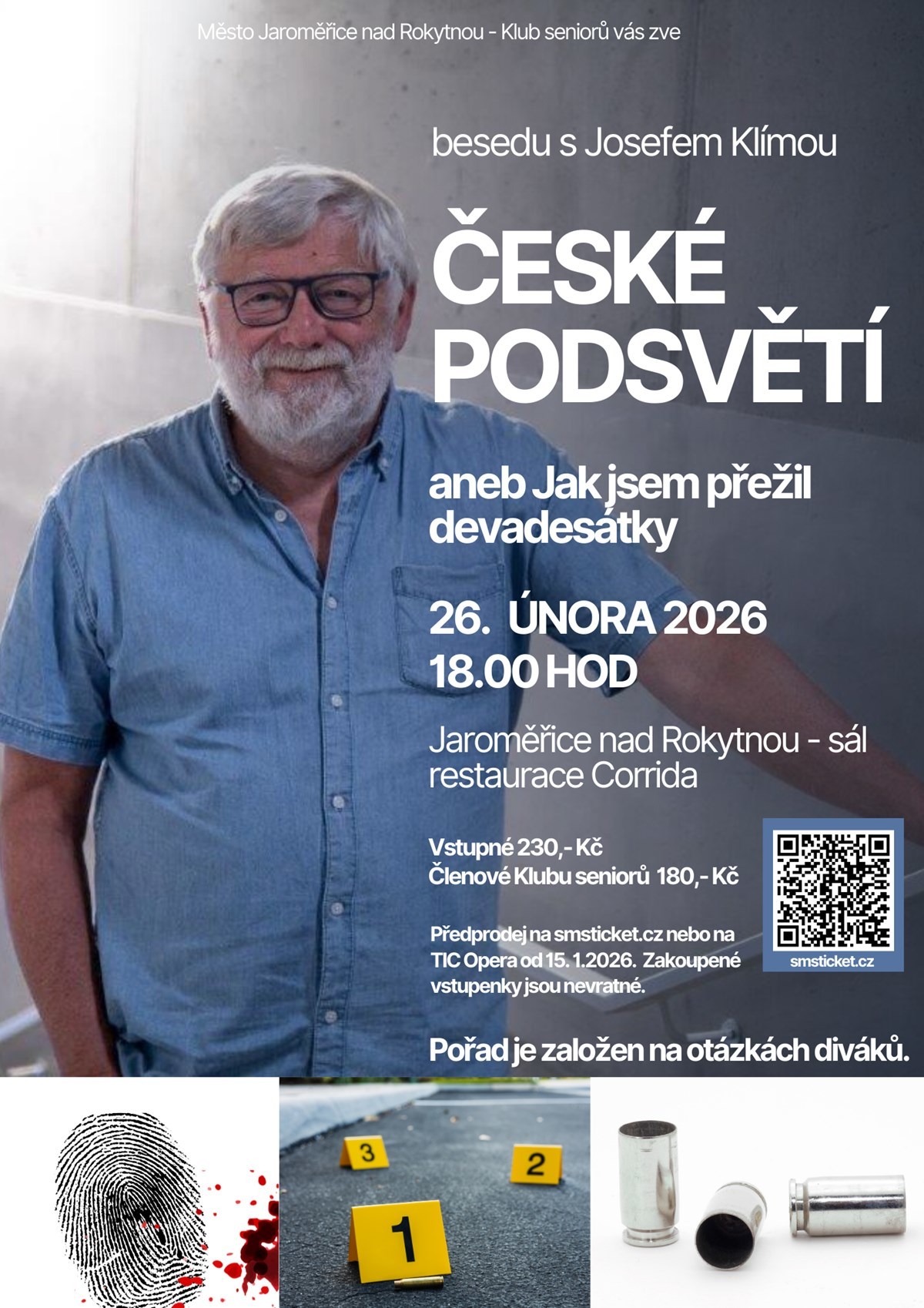 České podsvětí – Autor populárního pořadu „Jak jsem přežil devadesátky“, zakladatel investigativní žurnalistiky u nás Josef Klíma vypráví o divokých „devadesátkách“, o tom, jak se setkával s tehdejšími mocnými mafiány, od Jonáka až po Krejčíře, jak nebezpečné tehdy bylo být novinářem, ale i tom, jak se zločin mezitím proměnil.