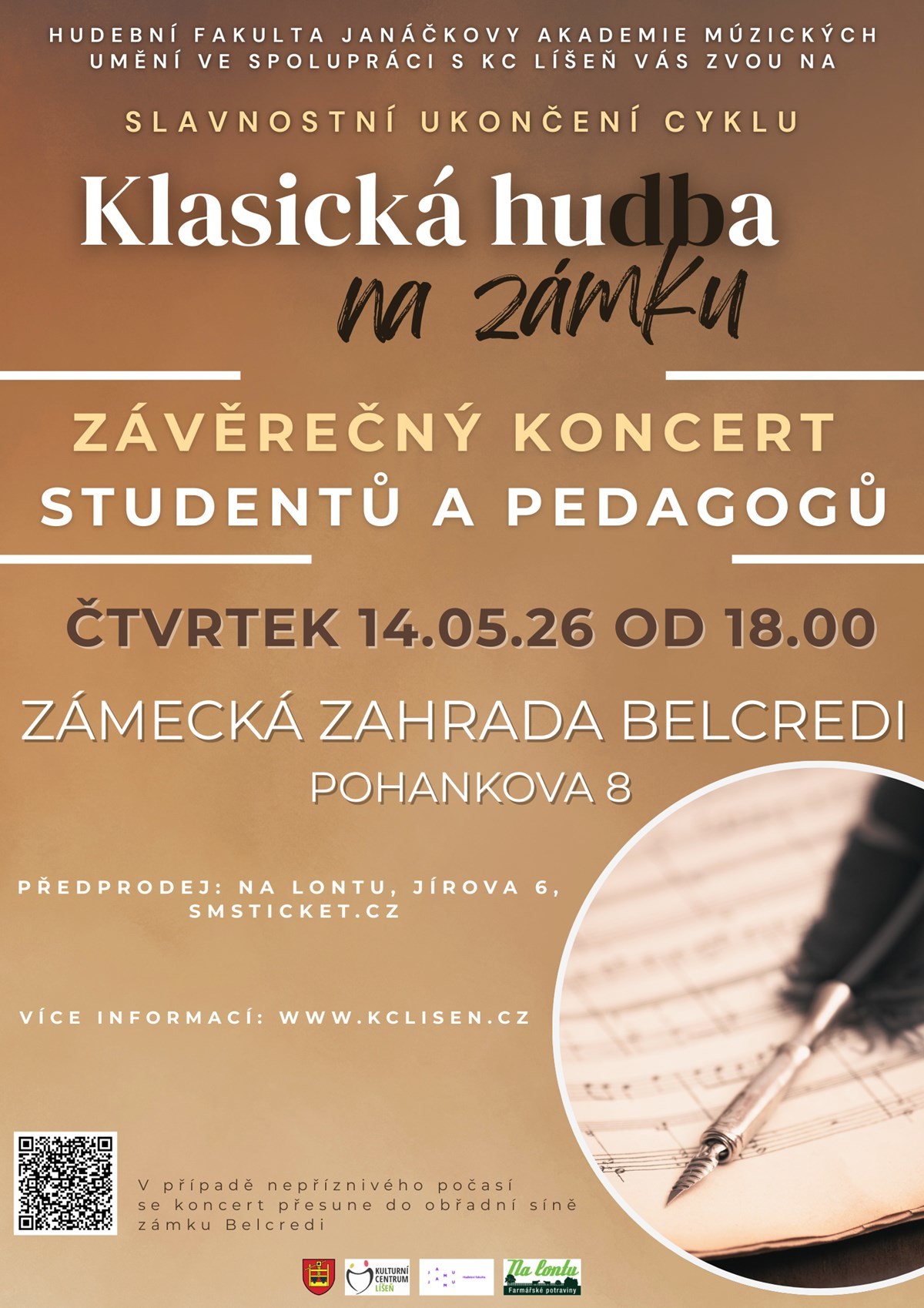 Závěrečný koncert se uskuteční v zámecké zahradě zámku Belcredi, Pohankova ulice. Díky této události máte výjimečnou možnost se do zahrady podívat a užít si její krásnou atmosféru. Začátek akce je v 18 hod.