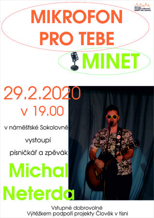 První vystoupení proběhne už v sobotu 29. února od 19 hodin, kdy vystoupí písničkář a kytarista Michal Neterda. Můžete jej znát pod uměleckým jménem MINET. Přijďte Michala podpořit. Vstupné bude dobrovolné a výtěžek z jeho koncertu poputuje na podporu projektů Člověka v tísni.
