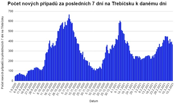 Na následujícím grafu vidíte vývoj počtu nových případů onemocnění Covid-19 za posledních 7 dní na Třebíčsku (tj. ve správním obvodu obce s rozšířenou působností Třebíč). Graf zahrnuje období od 1. září 2020, kdy začalo nemocných výrazněji přibývat, do 15. března 2021. Novými případy za posledních 7 dní se rozumí počet osob pozitivně testovaných na onemocnění Covid-19 za předchozích 7 dní.Počet nových případů onemocnění Covid-19 za posledních 7 dní v jednotlivých obcích na Třebíčsku shrnuje následující tabulka. Data se vztahují k 15. březnu 2021.