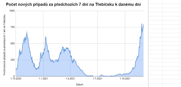 Následující graf shrnuje počet nových případů za posledních 7 dní na Třebíčsku od počátku března 2020, kdy se začala tato data počítat, do 2. prosince 2021. Data vycházejí z otevřených datových sad Ministerstva zdravotnictví České republiky.