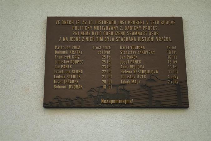 „Ve dnech 13. až 15. listopadu 1951 proběhl v této budově politicky motivovaný 2. babický proces, při němž bylo odsouzeno sedmnáct osob a na jedné z nich tím byla spáchána justiční vražda,“ stojí v záhlaví pamětní desky, která byla na budovu Komunitního centra MORAVIA umístěna proto, že v roce 1951 byl soudní proces konán právě v této budově, tehdy kině Svět. K trestu smrti zde byl odsouzen páter Jan Bula.