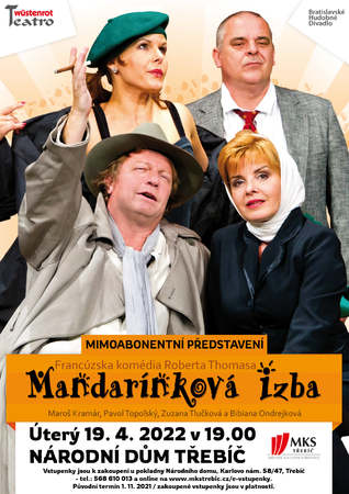 V úterý 19. 4. 2022 se můžete těšit na francouzskou komedii Roberta Thomase Mandarínková izba. Představení se uskuteční od 19 hodin v Národním domě v Třebíči.