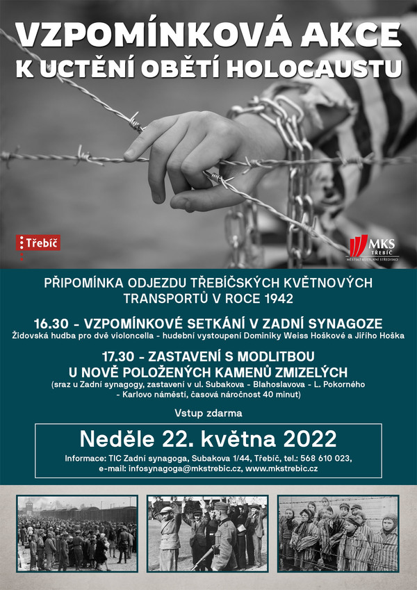 Městské kulturní středisko Třebíč připravilo na neděli 22. května 2022 v Zadní synagoze vzpomínkovou akci k uctění památky židovských obyvatel Třebíče a okolí, jejichž životy byly zmařeny v koncentračních a vyhlazovacích táborech.