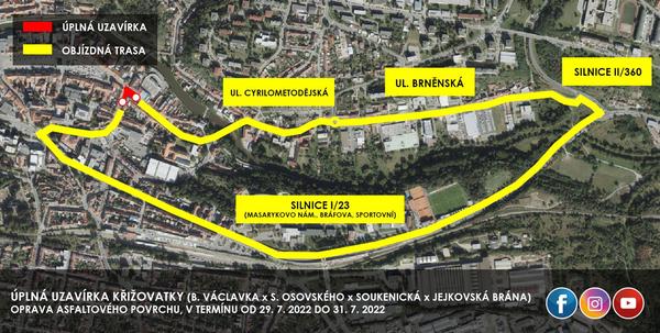 Křižovatka ulic Bedřicha Václavka, Smila Osovského, Soukenická a Jejkovská brána bude uzavřena od pátku 29. 7. od 18:00 do neděle 31. 7. do 8:00. Objízdná trasa povede ulicemi Bedřicha Václavka, Masarykovo náměstí, Bráfova třída, Sportovní, Brněnská, Cyrilometodějská a Smila Osovského.
