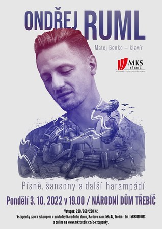 Ondřej Ruml, jedna z nejvýraznějších osobností tuzemské pěvecké scény vystoupí v Třebíčiv pondělí 3. 10. 2022 se svým recitálem „Písně, šansony a další harampádí“. Koncert se uskuteční v Národním domě od 19 hodin. Vstupenky jsou k zakoupení u pokladny Národního domu, Karlovo nám. 58/47, Třebíč - tel.: 568 610 013 a online na www.mkstrebic.cz/e-vstupenky.