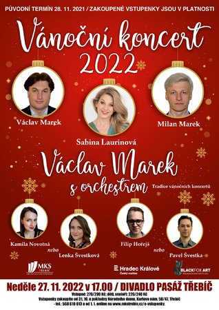 „Vánoční koncert 2022“ se uskuteční na první adventní neděli 27. 11. 2022 od 17 hodin v divadle Pasáž (původní termín 28. 11. 2021 / zakoupené vstupenky jsou v platnosti). Vánoční koncert přináší vedle domácích šlágrů a celosvětově známých a osvědčených evergreenů také oblíbené vánoční písně a skladby včetně nejkrásnějších klasických českých koled.