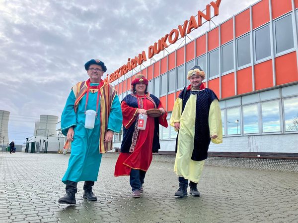 Vzácná návštěva včera přijela na tradiční novoroční koledování za dukovanskými energetiky. Popřát do nového roku přišli elektrárně a jejím zaměstnancům Tři králové, kteří mohli díky příznivé situaci koledovat přímo v areálu elektrárny. Pláště a královské koruny oblékli vedoucí zařízení Oblastní charity Třebíč. Kromě štědrých příspěvků od zaměstnanců dostali koledníci také chutný oběd v závodní jídelně.