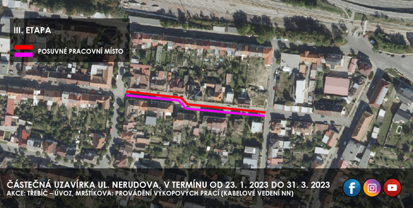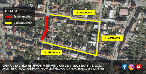 V termínu od 23. ledna do 31. března probíhají výkopové práce a přeložky kabelového vedení nízkého napětí. V ulici Mrštíkova a Úvoz probíhají práce za úplné uzavírky silnice, s objízdnou trasou po ulicích Nerudova, Sedlákova a Březinova. V Nerudově ulici jsou práce prováděny za částečné uzavírky, ulice je s omezením průjezdná.