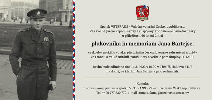 V sobotu 11. března 2023 si Vás dovolujeme pozvat do Třebíče na slavnostní odhalení pamětní desky československému vojákovi, parašutistovi a veliteli výsadku Potash, plukovníkovi in memoriam Janu Bartejsovi. Operace Potash byl krycí název pro paradesantní výsadek vyslaný během II. světové války z Anglie na území Protektorátu Čechy a Morava.