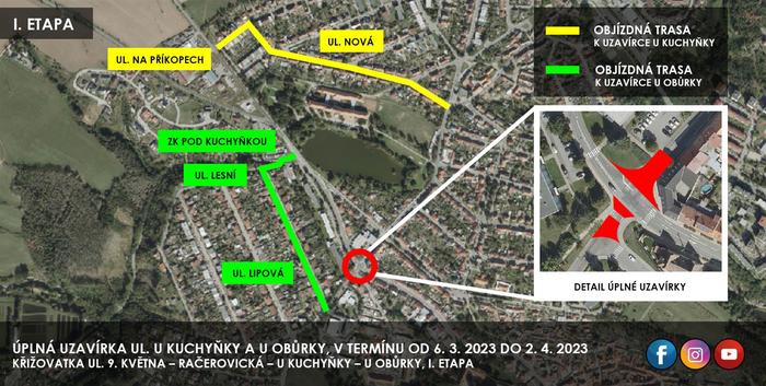 Objízdná trasa uzavírky v ulici U Kuchyňky pro vozidla do 3,5 tuny povede obousměrně ulicemi Na Příkopech, Nová a U Kuchyňky. Pro vozidla nad 3,5 tuny povede objížďka po silnici č. II/351 (9. května, Žerotínovo náměstí, Komenského náměstí), poté po silnici I/23 (Komenského náměstí, Masarykovo námětí, Bráfova ulice, Sportovní ulice) a po ulici Rafaelova.