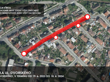 V souvislosti s rekonstrukcí bude v termínu od 19. června 2023 do 18. června 2024 ulice Dvorského úplně uzavřena pro auta. Vstupy do nemovitostí budou zachovány a vždy zůstane průchozí jeden chodník.