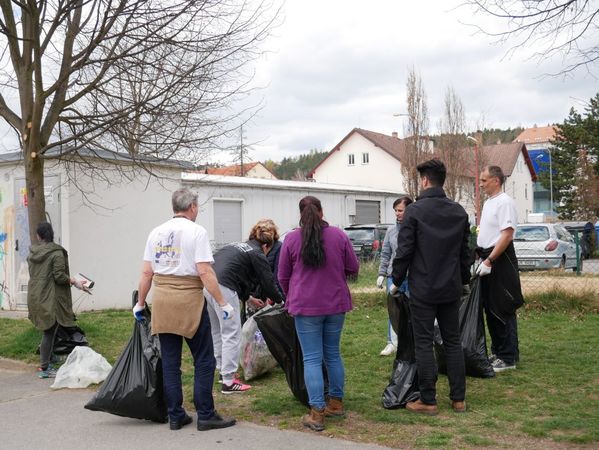 Hned na začátku se účastníci rozdělili na dvě party. Jedna část šla uklidit oblast kolem krajského úřadu podél Koželužského potoka a cyklostezky na Telečské. Druhá parta vyrazila směrem od benziny ONO Rantířovskou ulicí a dále k obchodnímu centru Aventin až do městské části Hosov. A hned začátek cesty stál za to. Vítr zřejmě odfoukal igelitové rukavice z benzinky, takže přilehlé prostranství kousek od Sociálního centra Kraje Vysočina jimi bylo poseté.