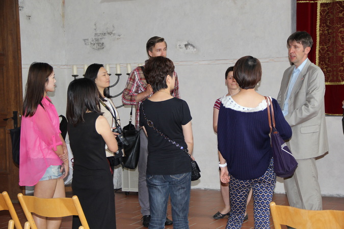 Novinářky zaujal židovský talit, což je modlitební plášť, který židovské muže provází celý život a jsou s ním i pohřbeni, také předmanželská smlouva, ve které jsou popsány povinnosti muže a ženy a kterou si vyvěšují na zeď ložnice, a také se zajímaly o židovský způsob stravování,“ popisuje Dagmar Juráňová z Informačního centra, která novinářky provázela. Výklad probíhal v angličtině a současně byl doplňovaný ředitelem Czech Tourismu Šanghaj Františkem Reismüllerem do čínštiny, přičemž si novinářky dělaly poznámky a fotografovaly.
