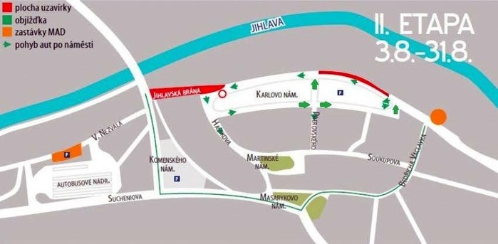 Upozorňujeme všechny občany, že druhá etapa spojená s rekonstrukcí kanalizace na Karlově náměstí začne již příští týden v pondělí, tedy 3. srpna 2015. Proti dřívějšímu předpokladu bude i nadále omezen průjezd spodní částí náměstí od domu č. p. 21 až po dům č. p. 33, a bude stále uzavřena Jihlavská brána.