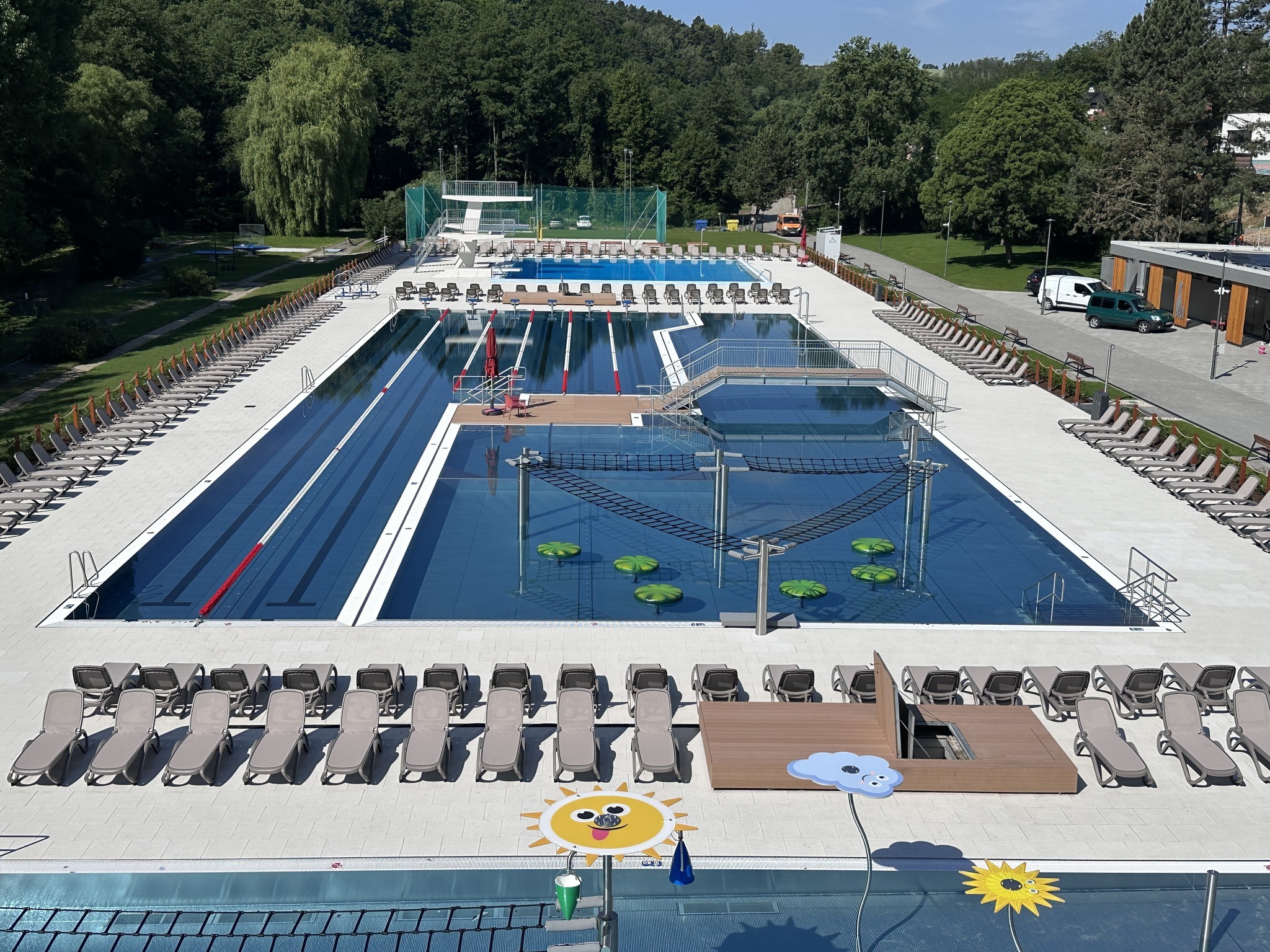 novinky: pool bar a občerstvení s lehátky a stříškami, nový trávník a vstupní budova